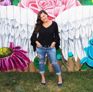 Starting with tops, I am wearing a black bell sleeve top by Chelsea28. It is a brand I usually shop at Nordstrom. However, I am not ALWAYS (only sometimes) in agreeance with paying the Nordstrom price (I’m usually a sale rack shopper). Here are a few bell sleeve tops on Amazon to give you the same look!